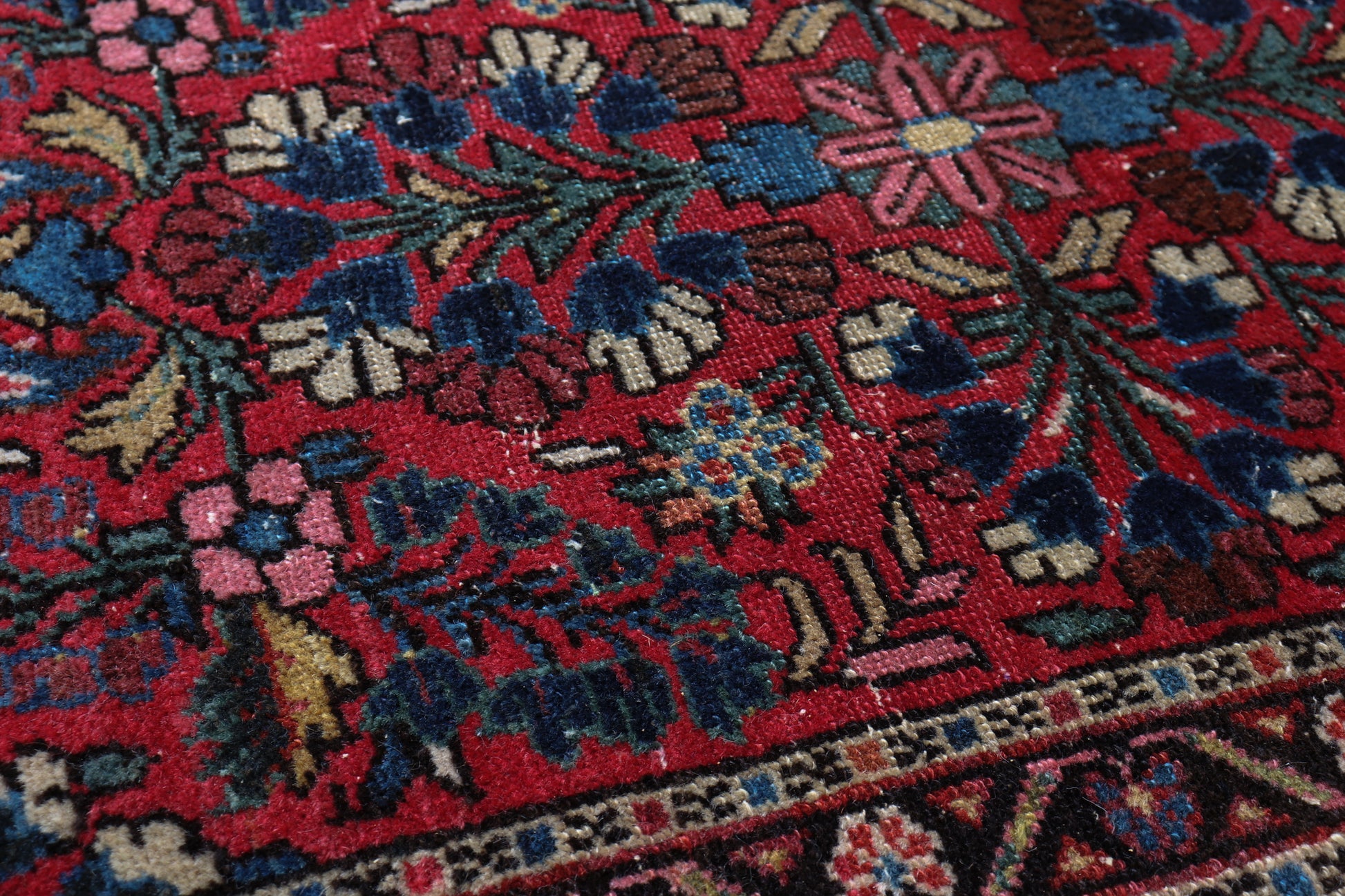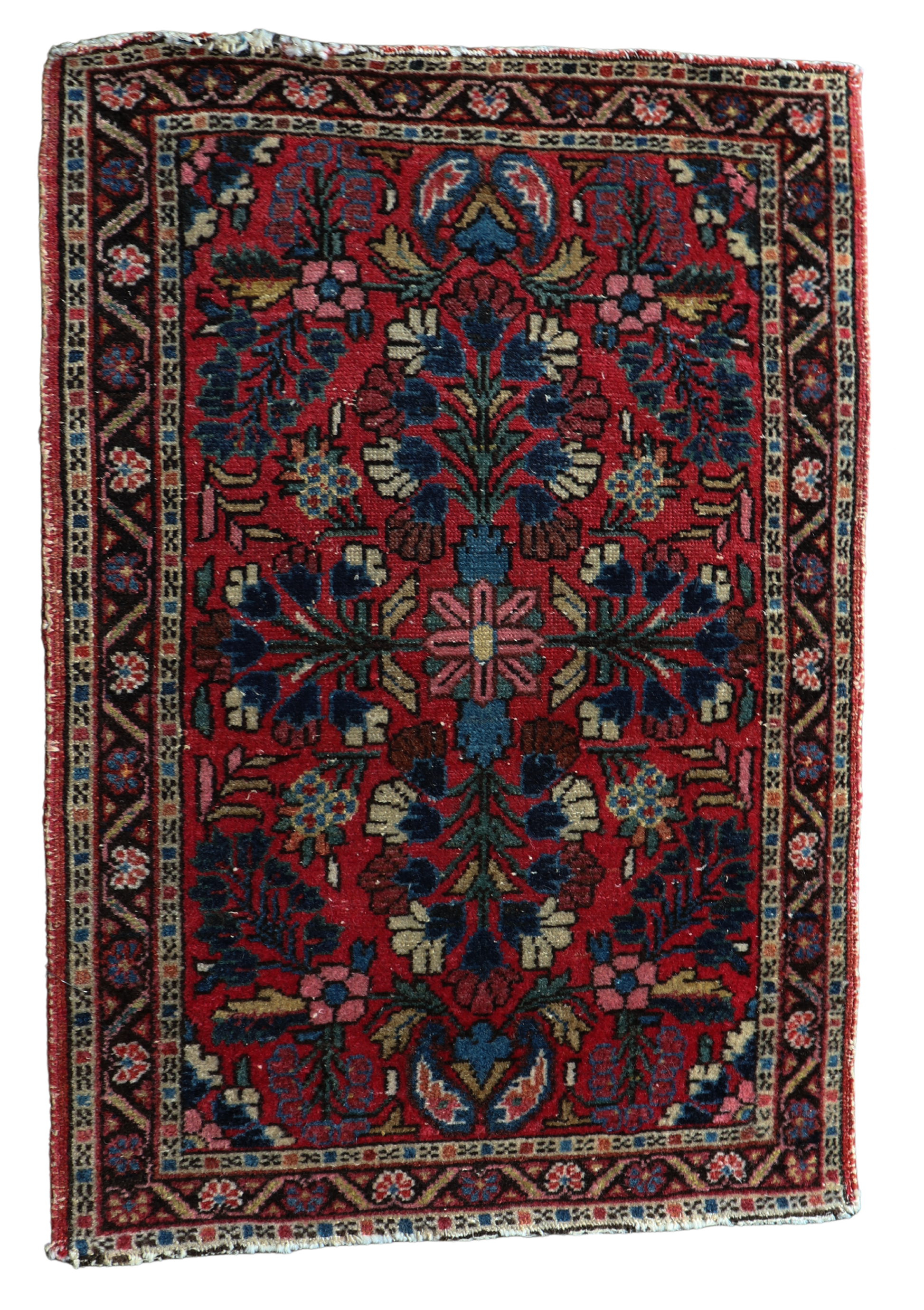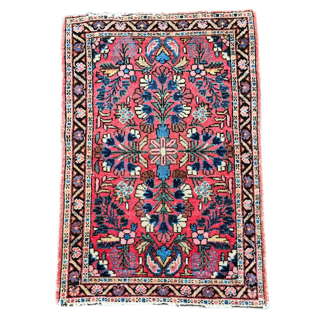 Vintage handmade rug. Professionally cleaned and edges reinforced with overcast stitching. The rug is estimated to be ~100 years old.